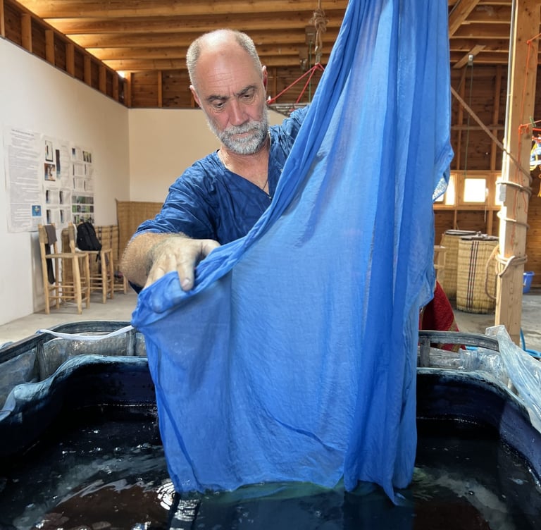 En el campo viviremos una experiencia profunda de aprendizaje: cuatro días de cestería en el taller del artesano Hamid Al-Halawi, trabajando con junco en telar horizontal y compartiendo el día a día con su familia; un taller de cocina en una granja ecológica, donde prepararemos platos con los productos de la huerta y los disfrutaremos juntas; y un encuentro con David Santandreu para descubrir su proyecto de recuperación del índigo marroquí, desde la plantación y el cuidado de la planta hasta la extracción del pigmento y su uso en los tintes. Cada participante podrá teñir su propio pañuelo y experimentar con diferentes intensidades de azul.