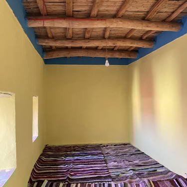 La casa cuenta con cinco amplias habitaciones alrededor de un patio central: Dos grandes dormitorios y un salón amplio que sirve como comedor y para actividades creativas como dibujar, leer, escribir. Dos espacios de trabajos equipados con telares tradicionales. Dos baños exteriores con ducha (estilo occidental). Y una gran terraza con vistas impresionantes del paisaje, ideal para encontrar inspiración